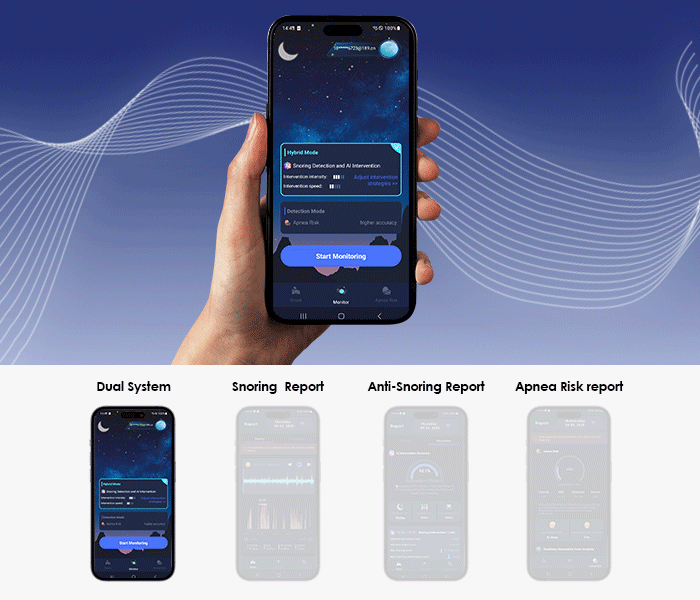 Der Nitetronic A1 lernt selbstständig Ihre Schlafumgebung kennen und filtert aktiv störende Umgebungsgeräusche wie Schritte, Musik oder Gespräche heraus. Anschließend konzentriert er sich ausschließlich darauf, Ihr echtes Schnarchen zu erkennen. Dies gewährleistet eine Schnarcherkennungsgenauigkeit von 99,2 % und eine Erkennungsgenauigkeit von Atemstörungen von 82 %.
