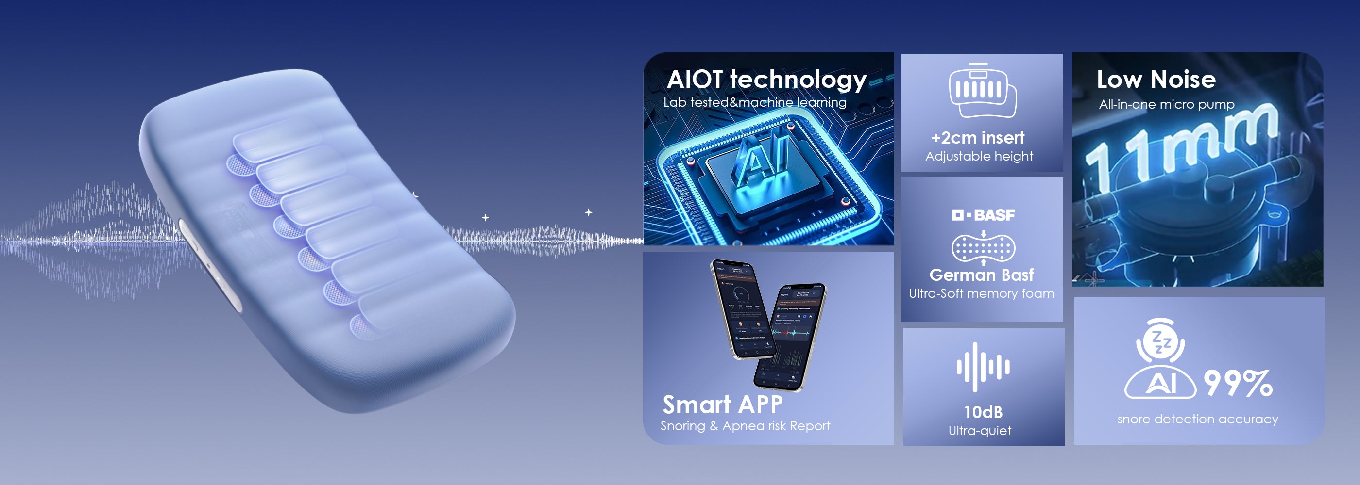 Der Nitetronic A1 bietet eine dynamische, mehrdimensionale, KI-gestützte intelligente Intervention und sorgt für ein personalisiertes Anti-Schnarch-Erlebnis. Er steuert präzise den Kopfdrehwinkel, die Höhe des Airbags und die Interventionsgeschwindigkeit auf der Grundlage Ihrer individuellen Daten: